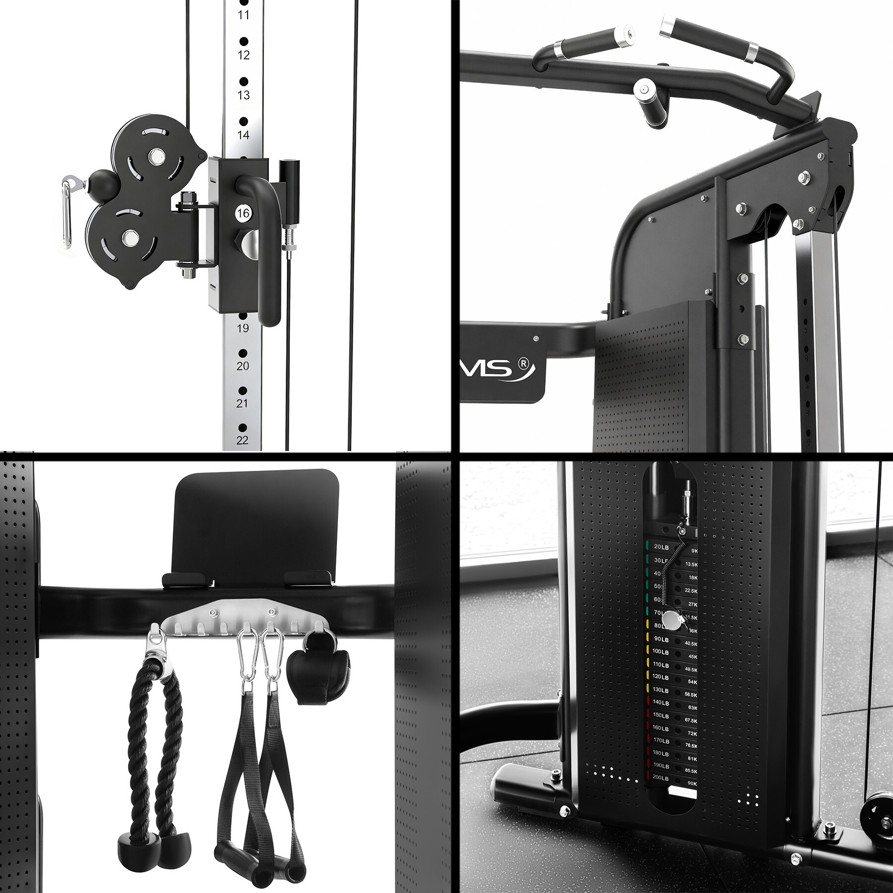 Bramę treningową wyposażono w dwa niezależne stosy obciążeń, każdy o wadze 90 kg. Magnetyczne piny pozwalają na szybkie i precyzyjne dopasowanie obciążenia, a wysokiej jakości linki oraz aluminiowe bloczki zapewniają płynność pracy nawet podczas dynamicznych treningów.
