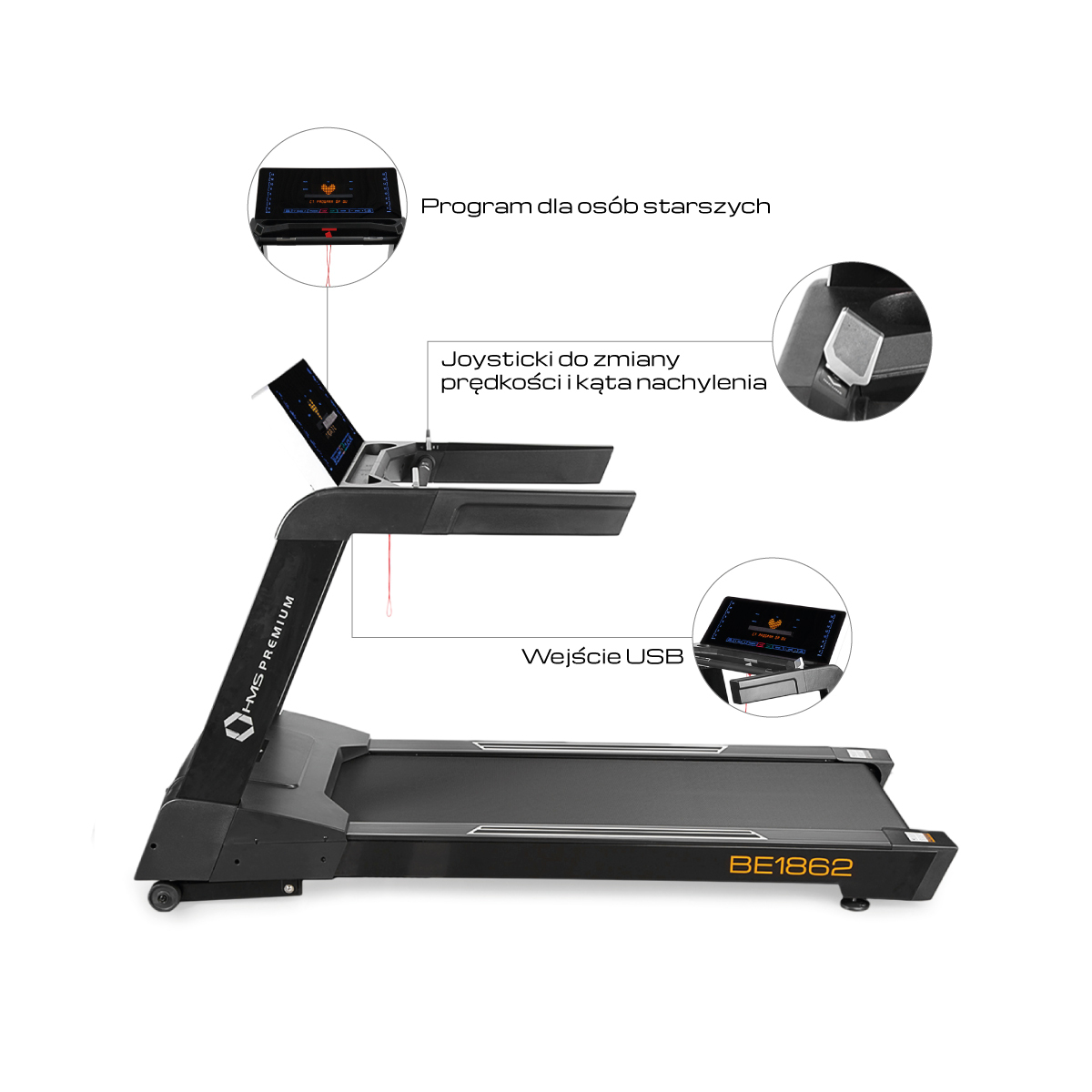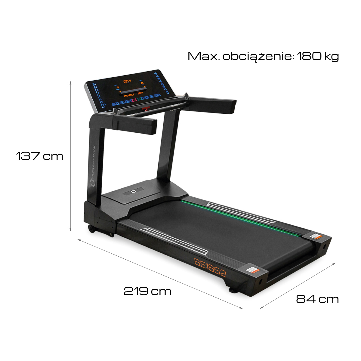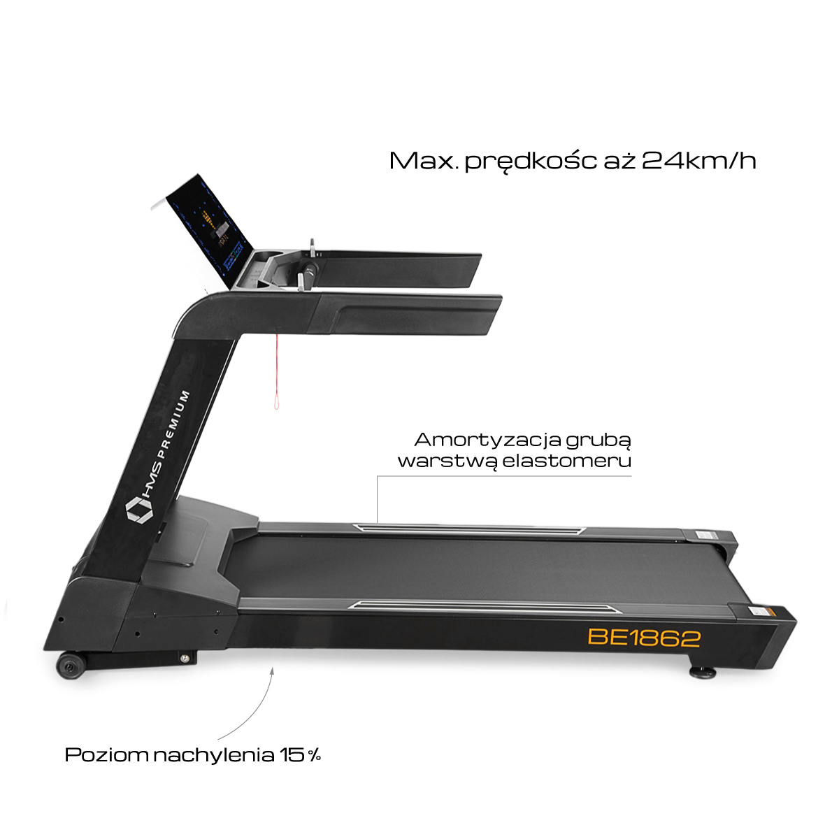 BE1862 HMS PREMIUM to bieżnia klasy SEMI COMMERCIAL, przeznaczona do użytku w małych klubach fitness.