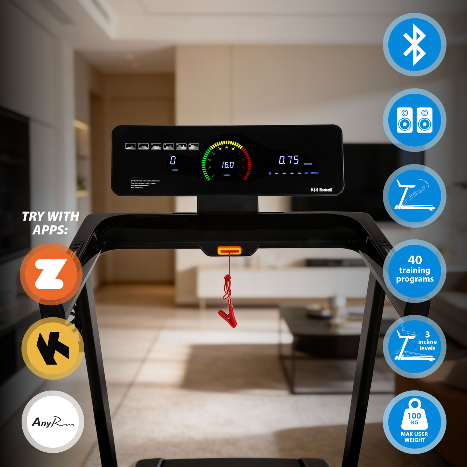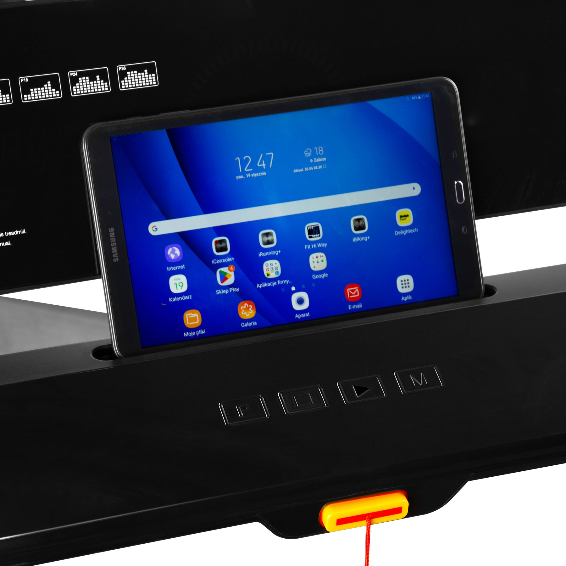 Wbudowany moduł Bluetooth oraz dwa głośniki umożliwiają odtwarzanie muzyki i dźwięków z aplikacji treningowych, a uchwyt na tablet zapewnia wygodne korzystanie z urządzeń mobilnych podczas biegu lub marszu.