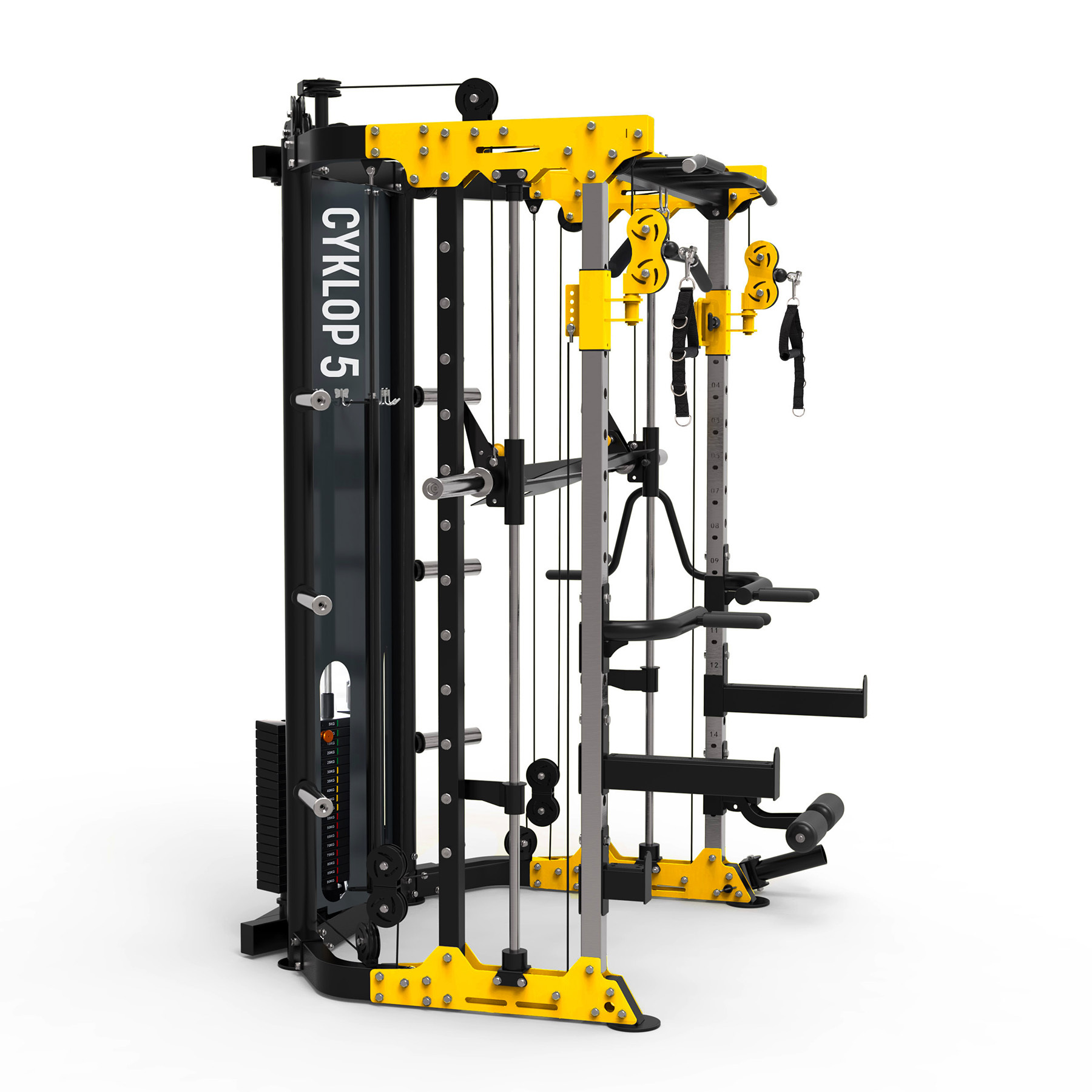 Cyklop 5 to zaawansowany atlas treningowy, który łączy w sobie funkcjonalność wielostanowiskowej maszyny siłowej z bezpieczeństwem i wygodą użytkowania. Dzięki dwóm niezależnym stosom po 90 kg, suwnicy Smitha, licznym uchwytom i dodatkom, Cyklop 5 oferuje kompleksowy trening całego ciała – od mięśni górnych partii aż po nogi.
