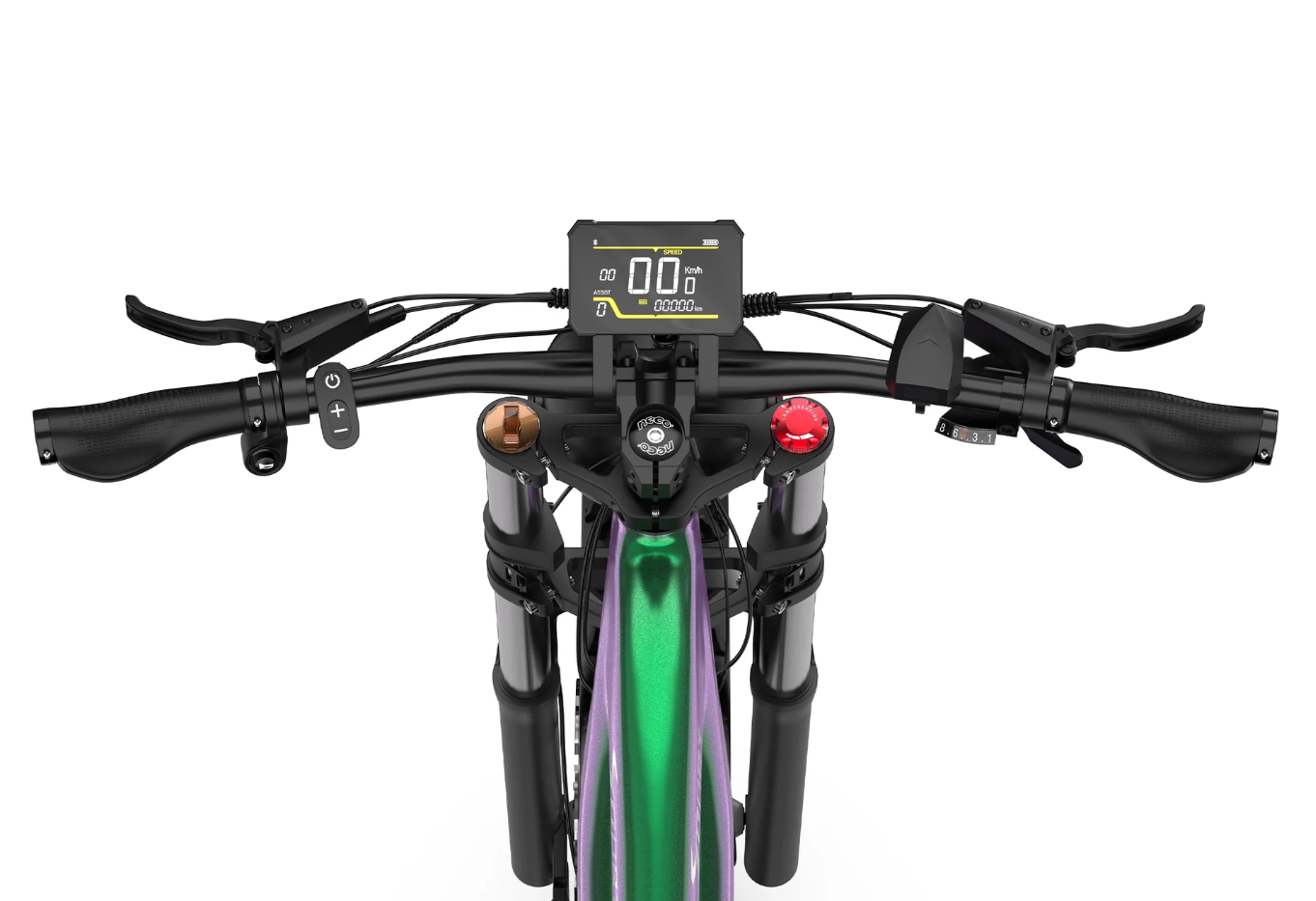 Model E26 wyróżnia się pełną aluminiową ramą, która jest nie tylko lekka i trwała, ale także posiada wyjątkowe wykończenie zmieniające kolor. Pod wpływem światła słonecznego rama przechodzi między odcieniami niebieskiego (zielonego) i fioletowego, w zależności od kąta padania światła. Ten unikalny efekt sprawia, że rower przyciąga wzrok i nadaje mu dynamiczny, futurystyczny wygląd, wyróżniający się na drodze.