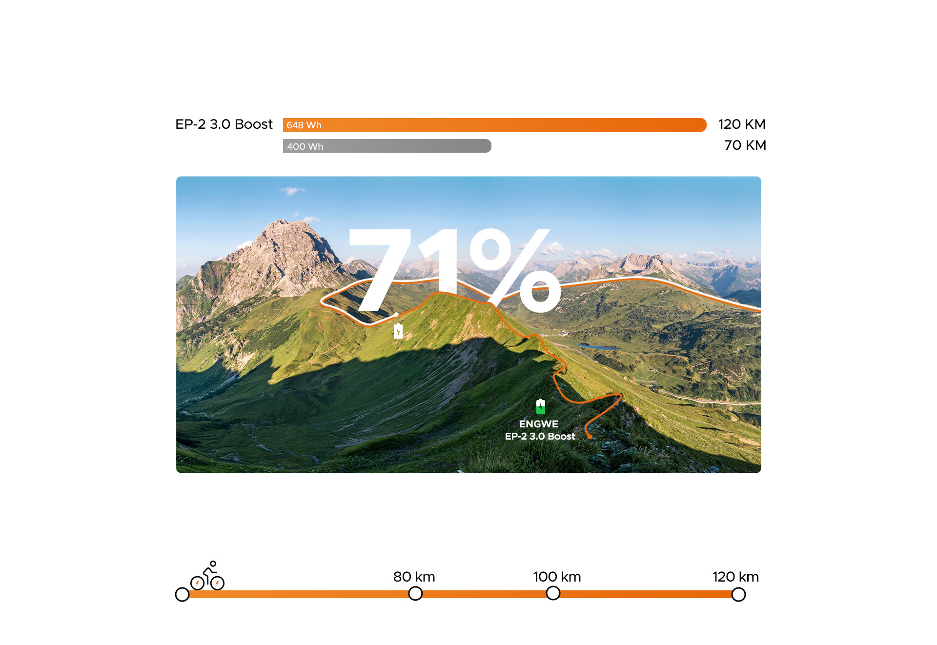 🔹 do 120 km w trybie niskiego wspomagania,