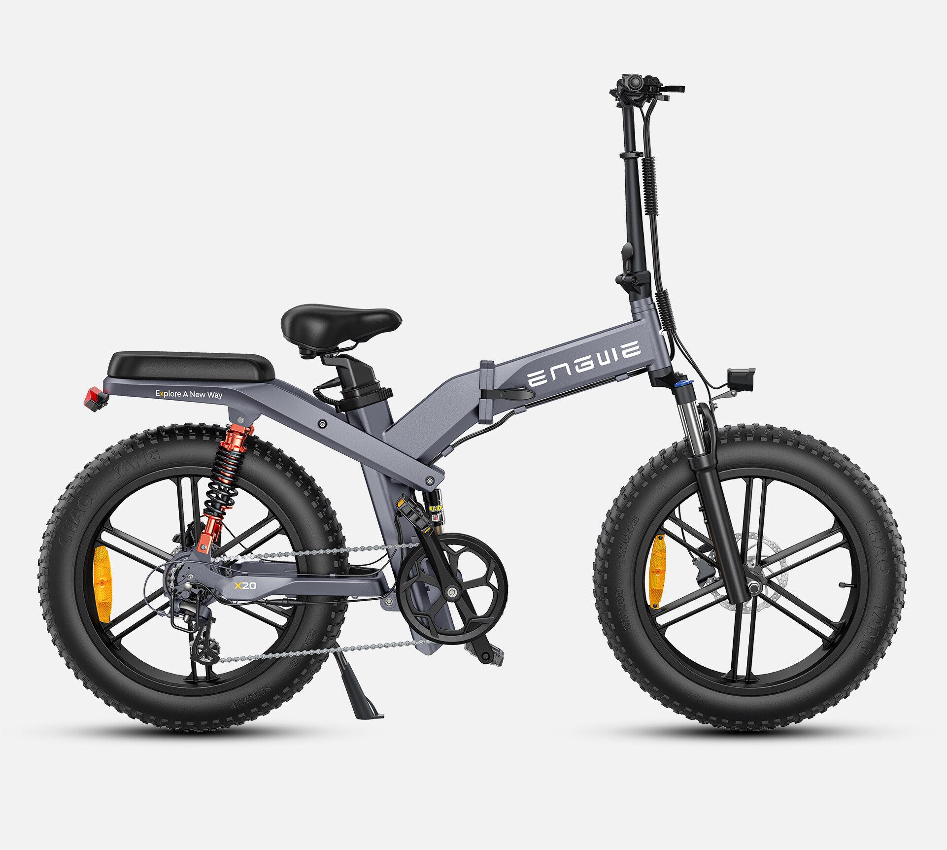 Składany pojazd elektryczny Engwe X20 . Dzięki potężnej mocy maksymalnej 750 W, dwóm akumulatorom, podwójnemu zawieszeniu i grubym oponom ENGWE X20 to wydajna bestia, która może pokonać każdy teren. Wyposażony w hydrauliczne hamulce tarczowe i 8-biegową przerzutkę Shimano, ten pojazd elektryczny zapewnia bezpieczniejszą i wygodniejszą jazdę, dzięki czemu idealnie nadaje się zarówno do dojazdów do pracy w mieście, jak i przygód w terenie.