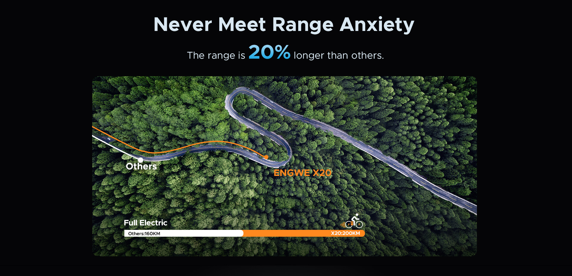 - Dzięki podwójnemu systemowi baterii, ENGWE X20 pozwala na podróżowanie nawet do 114 km na jednym ładowaniu w trybie wspomagania. Ten imponujący zasięg zapewnia możliwość eksploracji miasta do miasta, nie martwiąc się o wyczerpanie energii. Pożegnaj niepokój o zasięg i ciesz się swobodą jazdy przez dłuższe okresy.