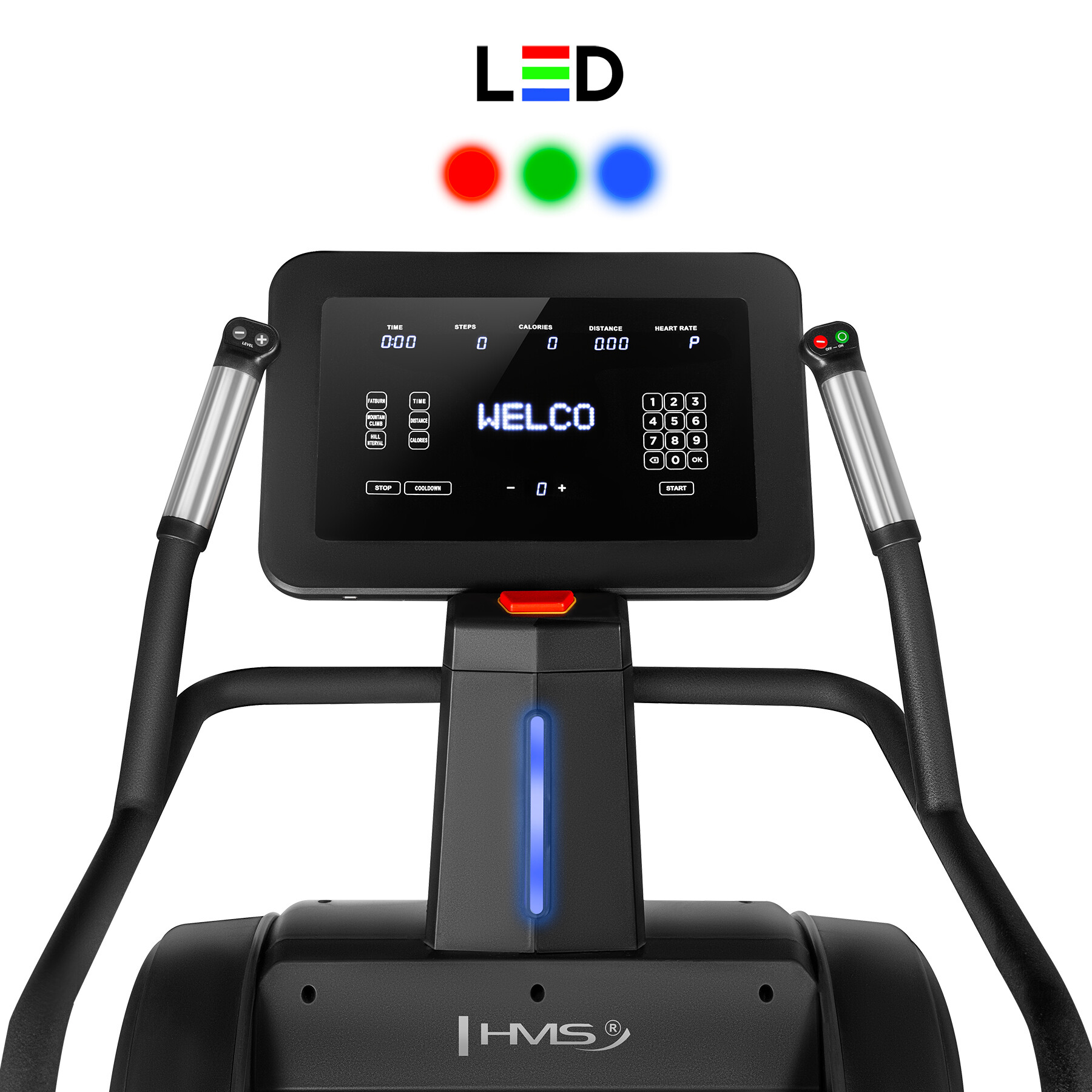 Model HMS ST03 wyposażono w podświetlenie statusowe LED, które w czytelny sposób informuje o stanie urządzenia. Niebieskie światło oznacza tryb gotowości, czerwone światło sygnalizuje stan alarmowy, natomiast zielone światło potwierdza prawidłową pracę maszyny. Rozwiązanie to zwiększa bezpieczeństwo oraz podkreśla nowoczesny, profesjonalny charakter sprzętu.