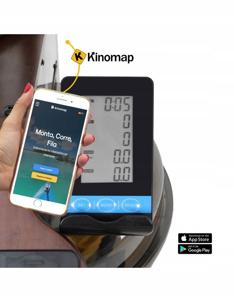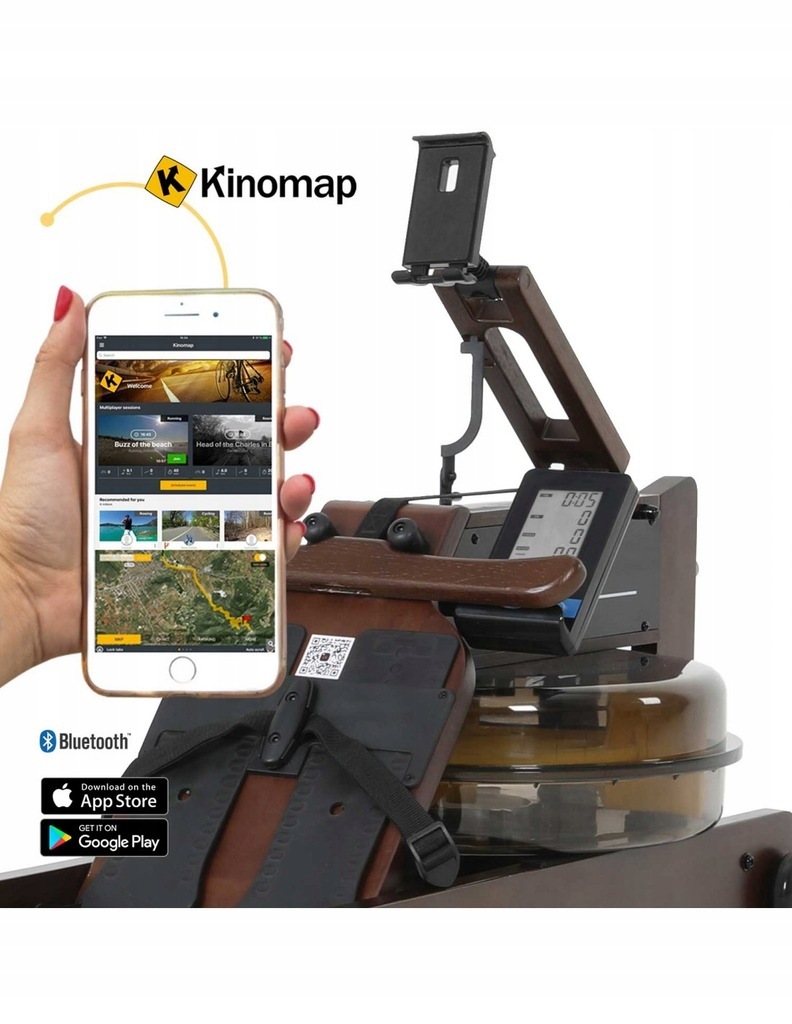 TECHNOLOGIA W SŁUŻBIE TWOJEGO SZKOLENIA. Wioślarz ten wyróżnia się nie tylko designem i konstrukcją, ale także technologią. Zawiera wyświetlacz LCD z Bluetoothem i kompatybilnością z aplikacją Kinomap, oferując interaktywne wrażenia, które przekształcają każdą sesję treningową w wirtualną przygodę.